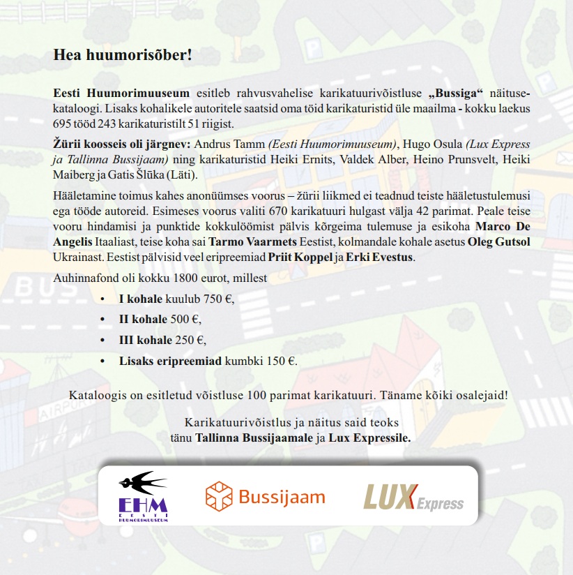 Eesti Huumorimuuseum koostöös oma partneritega bussifirma Lux Express ning Tallinna Bussijaam kuulutavad välja rahvusvahelise karikatuurivõistluse teemal: „BUSSIGA“.